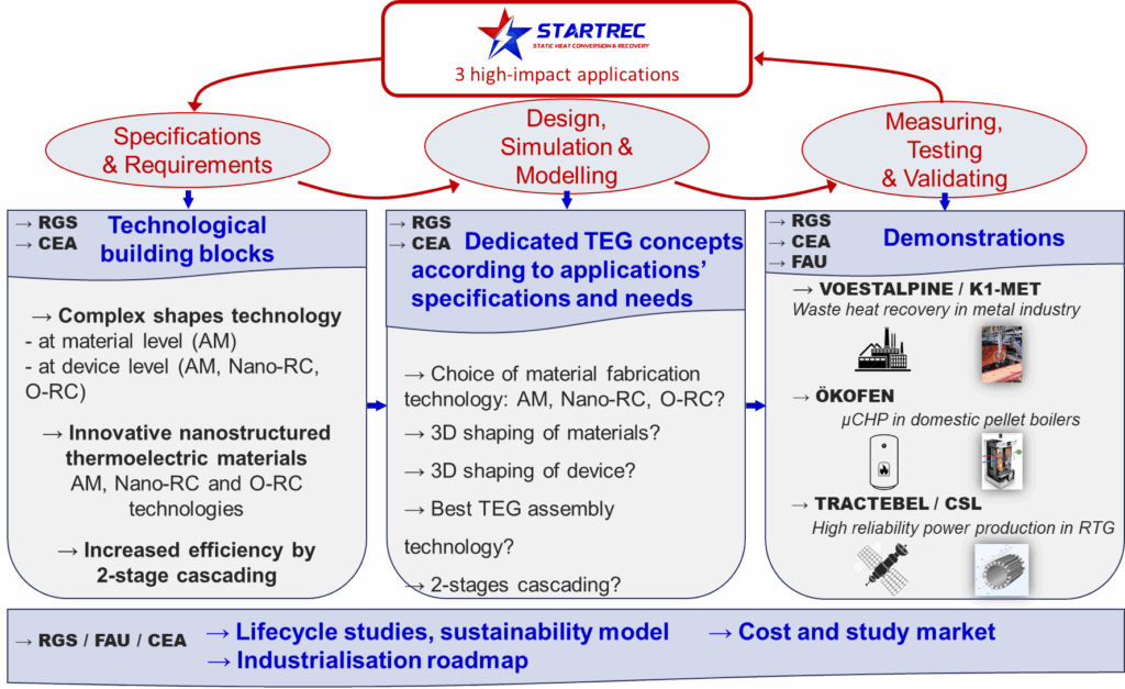 Since January 1st, 2025, the Commissariat à l’énergie atomique et aux énergies alternatives coordinates the EU-funded Horizon Europe Project STARTREC (Horizon Europe Grant Agreement 101160663). The focus of the new research project is the development of next-generation thermoelectric generators based on SiGe nanostructured materials with innovative device architectures, leading to double their efficiencies to 10 – 15 % and to demonstrate their high performances at TRL5 for three different and complementary high impact use cases.